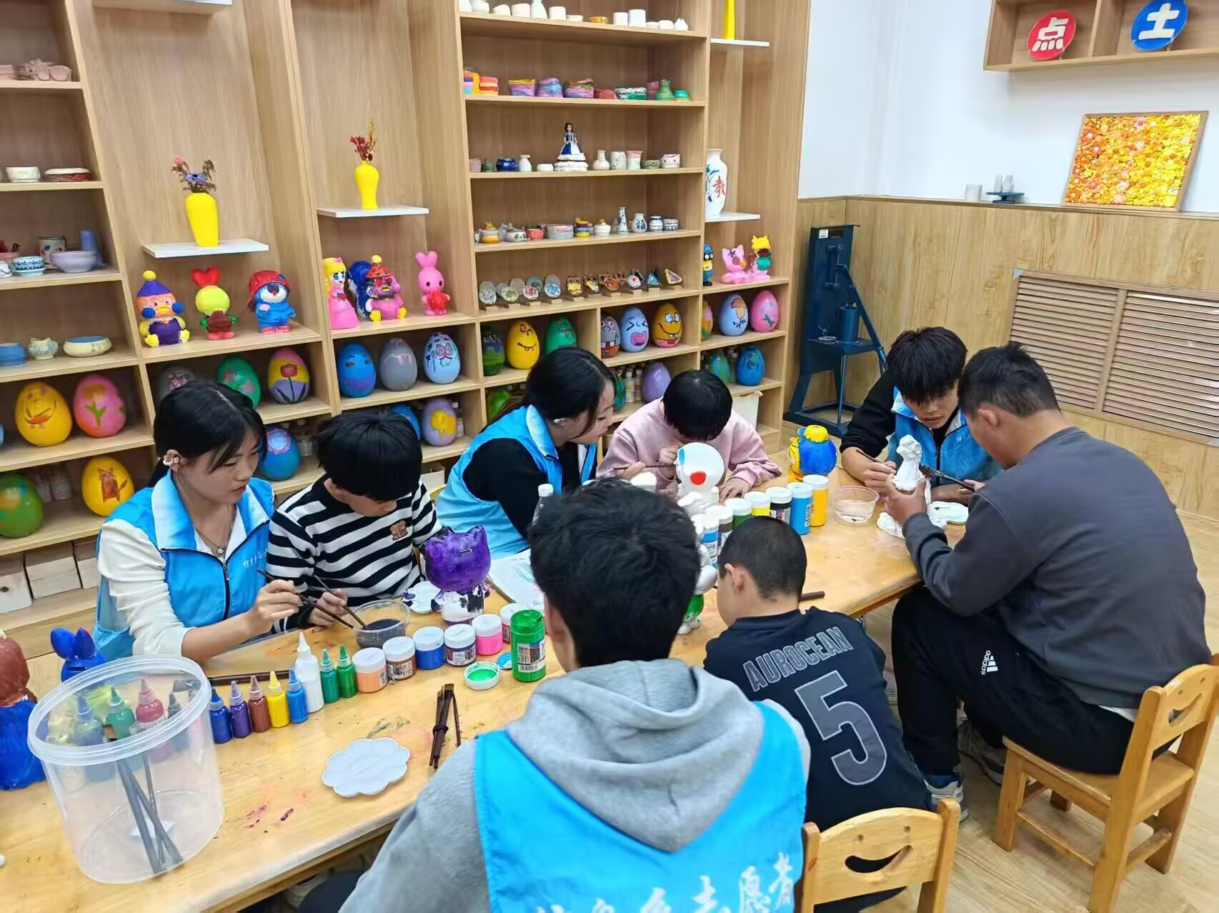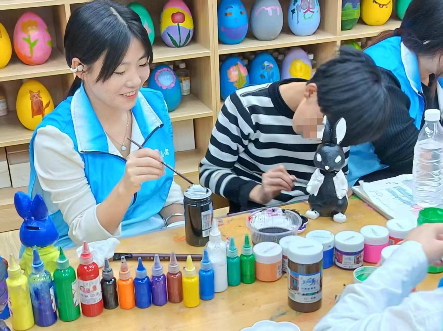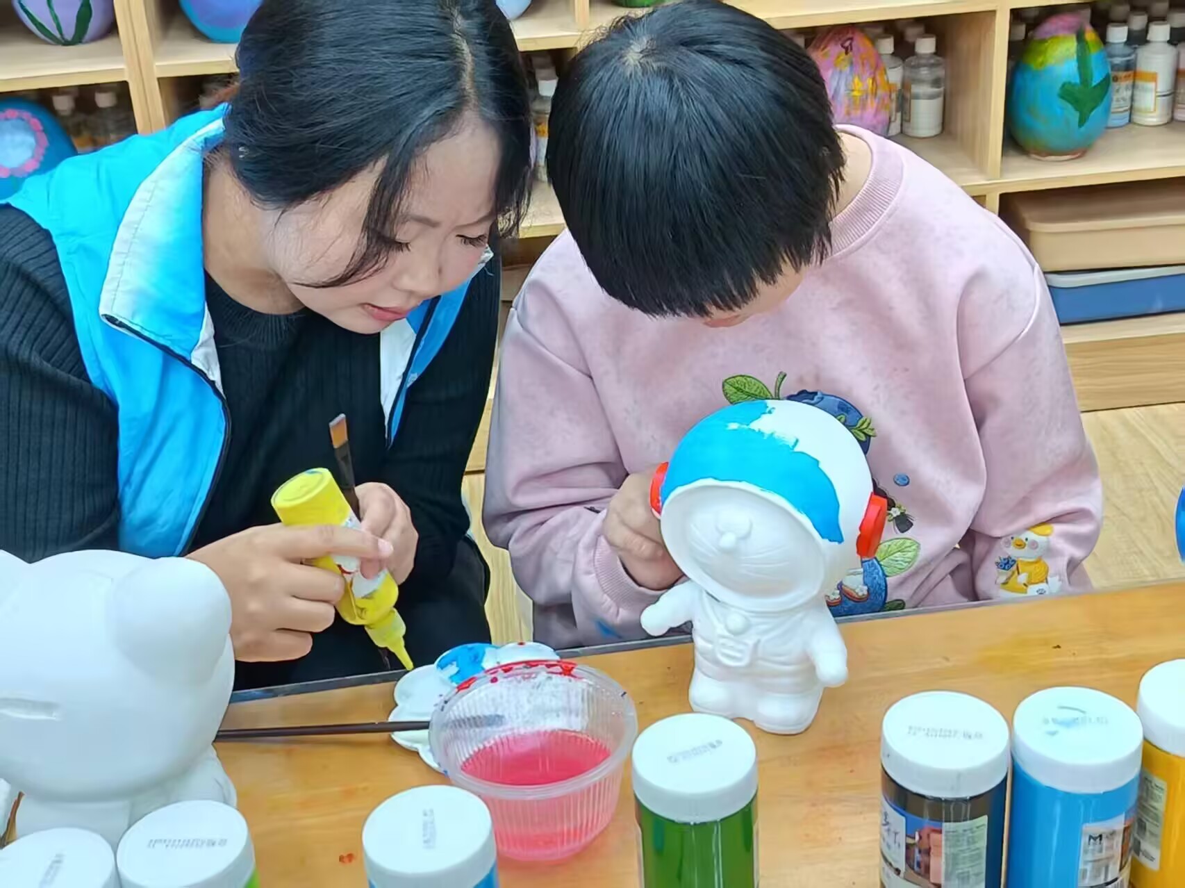 泥塑教室里,志愿者们耐心引导孩子们为石膏娃娃涂色,提前拆解涂色步骤,用简化的色彩搭配知识讲解冷暖色运用,还手把手指导他们掌握握笔力度与涂色均匀度;遇到操作有困难的孩子,便用“示范-辅助-独立尝试”的递进式方法帮孩子们推进创作,不仅锻炼了志愿者专业知识的实践转化力、提升了沟通技巧,更让他们服务社会的信念愈发坚定。